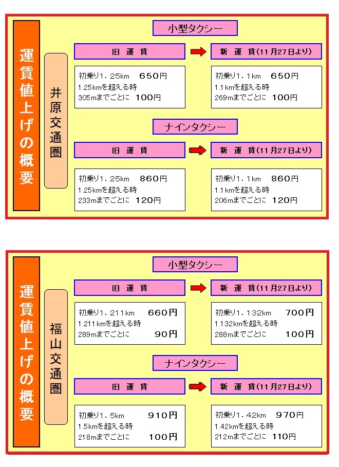 タクシー運賃改定のお知らせ(井原・福山圏)